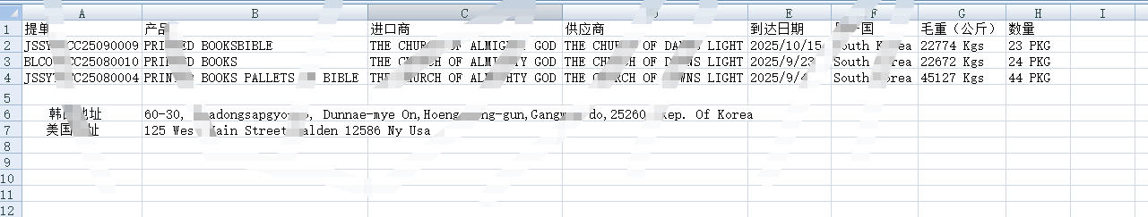 今日下午,反全能神联盟美国家属在美国海关记录发现三批标有(“全能神”邪教组织)的印刷品从韩国非法运往美国,这些印刷品实为“全能神”邪教组织传播邪教思想的工具,主要是邪教版本伪装成《圣经》的出版物及相关出版物。