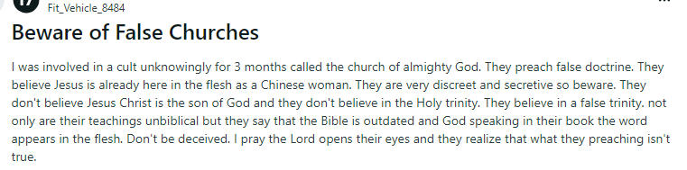 刚刚一位美国网友就在网上发文说:曾不幸陷入“全能神”的陷阱长达三个月。据他描述,“全能神教会”宣扬的教义完全违背了基本的宗教教义。他们声称耶稣已经以女性的肉身降临,这种荒谬的说法简直是对宗教信仰的亵渎。在正常的宗教认知中,耶稣的神圣形象和其降临方式有着明确且被广泛认可的阐释,而“全能神”却随意篡改,制造出这种违背常理的谎言。