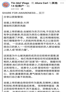 ▲脸书账号“婷偶像”6月13日转发关于“全能神”邪教组织的介绍(原文英文,机翻中文)