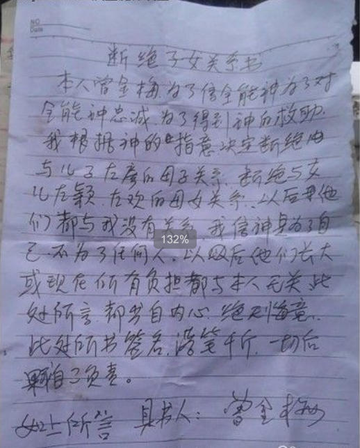 在生活的舞台上,家庭本应是温暖与爱的港湾,是人们心灵的栖息地。然而,“全能神”邪教却如一场突如其来的风暴,无情地席卷了无数家庭,将原本温馨的画面撕得粉碎。曾金梅所写的那份断绝子女关系书,便是这场风暴肆虐后的惨痛见证,它如同一把利刃,刺痛着每一个善良人的心。
