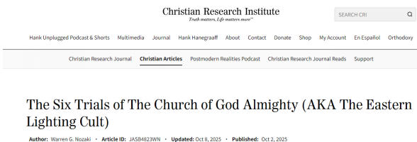 编者按:2025年10月2日,《基督教研究期刊》(Christian Research Journal)刊发论文《“全能神”的六大审判》(The Six Trials of the Church of God Almighty)剖析“全能神”邪教歪理邪说,揭露出“全能神”冒充基督,通过所谓的“六大审判”对成员进行贬损打压,进而实施精神控制。作者沃伦·G·诺扎基(Warren G. Nozaki)是美国基督教研究协会(Christian Research Institute)研究员,拜欧拉大学塔尔伯特神学院神学硕士。中国反邪教编译如下: