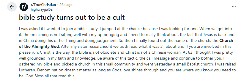 这个美国人知道真相后,特别生气,也特别庆幸自己没有完全被这些对他传教的人洗脑。他赶紧提醒身边的人,要是卷进这个邪教组织可就糟了,一定要赶紧远离。这个美国人都63岁了,他一直觉得自己对信仰和知识了解得很扎实,毕竟在宗教方面也研究探索了这么多年。但面对这些对他传教的人宣扬的歪理邪说,他依然能保持清醒的头脑,没有被忽悠。他心里清楚,基督才是正道,圣经是永远不会过时的经典,基督肯定不是这些传教人说的那个中国女人。