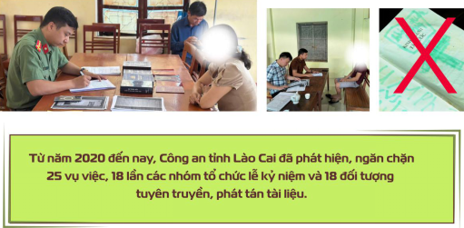 2020年至今,老街省公安厅共查处邪教相关案件25起、制止聚集活动18次,查处18人;查缴邪教非法出版物900余份、邪教标识钥匙扣500个、书籍数十册以及大量图片与存储设备;成功帮助400余人脱离非法教派活动。