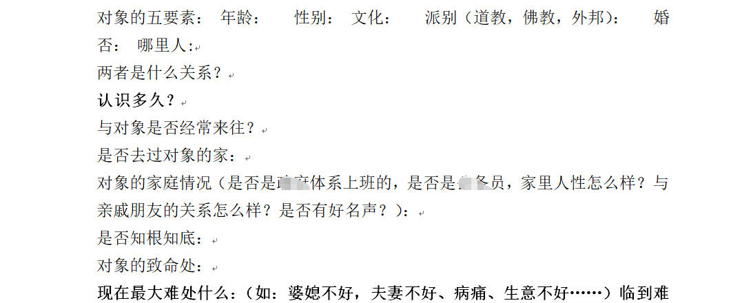 这张表格的危险性在于,它将人性弱点转化为可计算的数据模型。每个填空都是一把锁,最终将构成禁锢思想的铁笼。当我们发现有人对隐私如此饥渴时,要记住:真正的信仰从不需要人身档案,善良的组织绝不会建立受害者数据库。防范这种精神瘟疫,需要我们保持双重警惕:既要警惕陌生人的过分探询,也要警惕熟人的突然"关心"。在这个数据即权力的时代,保护个人信息,就是保护我们的灵魂自由。这张表格提醒我们,最危险的操控往往披着最温和的外衣,最邪恶的计划往往藏在最普通的问卷里。保持独立思考能力,守护个人心理边界,或许是我们这个时代最重要的生存技能之一。