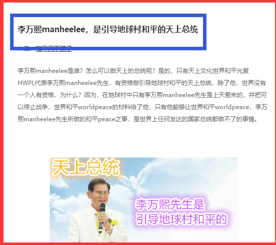 李万熙(manheelee),1931年9月15日出生于韩国庆尚北道,被神化为“圣灵保惠师”、“再临基督”、“上帝指派的牧师”、“天上总统”。信徒称李万熙为“李主席”或“主席”。在李万熙胡诌的自传《我所走过的路和神的恩惠》中,他说“我是王室的后代,作为光来到这个世界。”“就在某一天,我遇见了从天而降的天人耶稣。”“我所到之处都有彩虹同行,有十字架(云彩)同行,有光同行”。