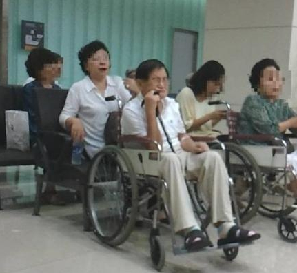 2013年,李万熙因猥亵、性侵一名未成年少女,事发后遭到报复,腿被打断后入院治疗。图中是李万熙坐在轮椅上的照片(照片来源:互联网)