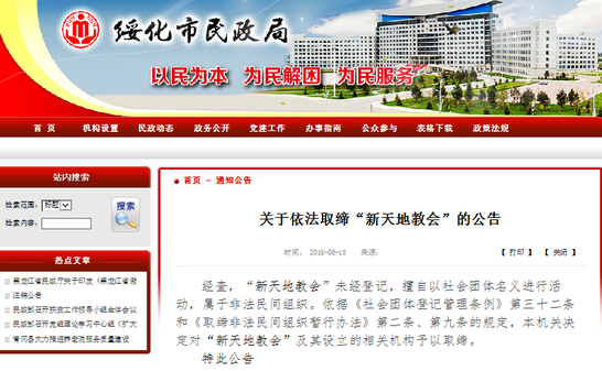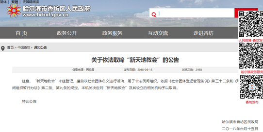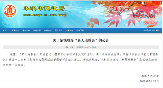 本溪市民政局2018年6月25日发布《关于依法取缔“新天地教会”的公告》称:经查,“新天地教会”未经登记,擅自以社会团体名义进行活动,属于非法社会组织。依据《社会团体登记管理条例》第三十二条和《取缔非法民间组织管理暂行办法》第二、第九条规定,本机关决定对“新天地教会”及其设立的相关机构予以取缔。