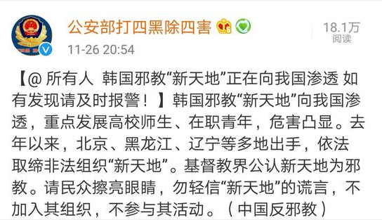 近日,中国反邪教“一网两微”、微博“公安部打四黑除四害”“全球反邪联盟”等发出警示,提醒民众“勿轻信‘新天地’的谎言,不加入其组织,不参与其活动。”